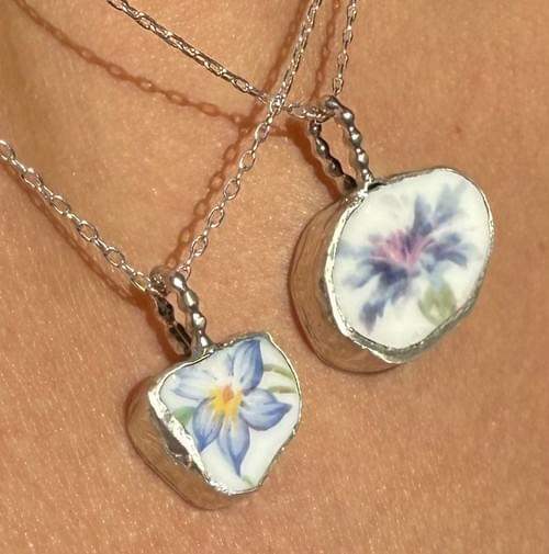 Sterling silver pendant - solid silver back with vintage china piece - vintage blue flower with yellow center design.