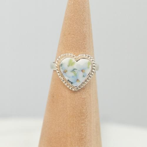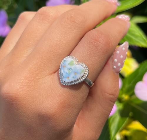 Blue flowers vintage china piece with sterling silver ornate heart bezel setting. Plain sterling silver band.