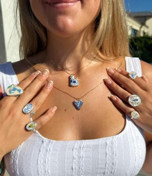 Hand painted blue flowers heart framed in 24 karat gold.