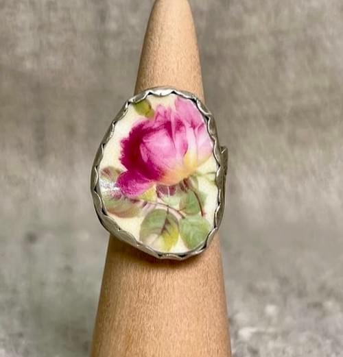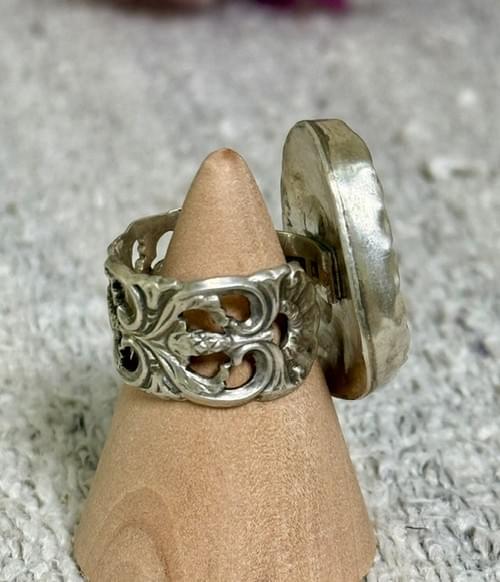 Sterling silver scalloped bezel setting on an antique sterling silver antique spoon.