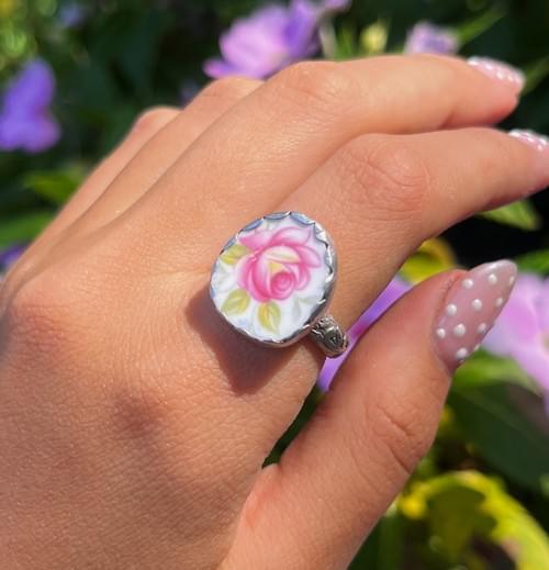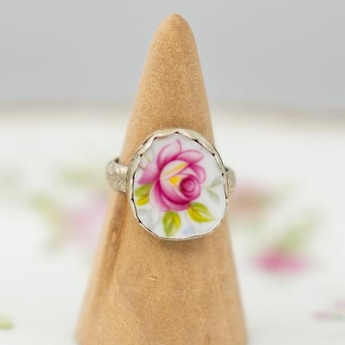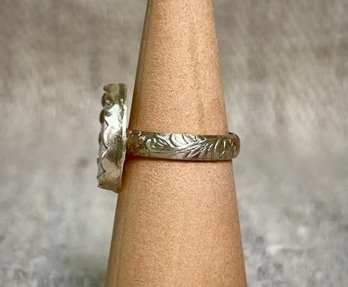 Sterling silver etched ring band with scalloped bezel that surrounds a porcelain china piece