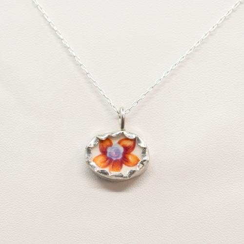 Sterling silver pendant with scalloped bezel - solid silver back with vintage china piece - vintage orange flower design.
