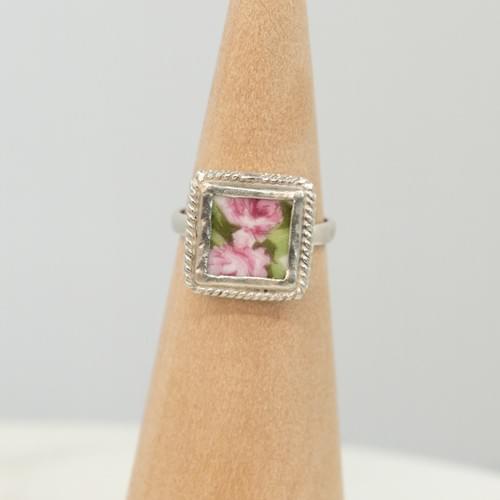 Pink roses vintage china piece with sterling silver ornate bezel setting. Plain sterling silver band.