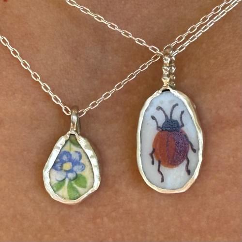 Sterling silver pendant with decorative scalloped bezel- solid silver back with vintage china piece - vintage red beetle design.