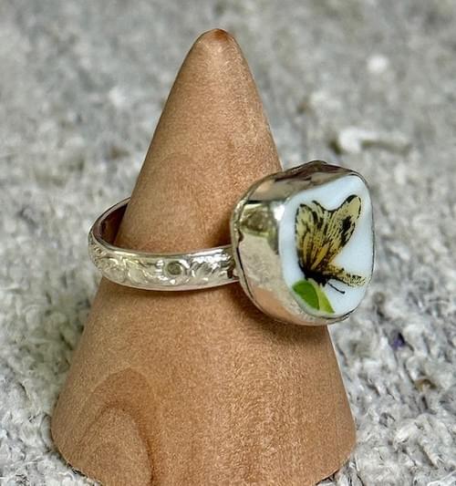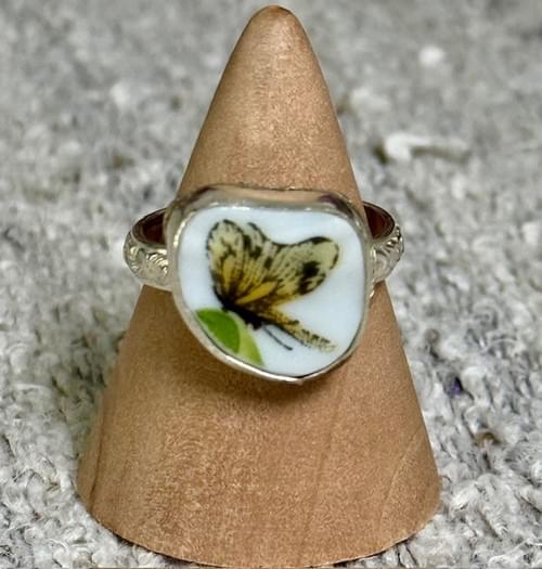 Sterling silver etched ring band with yellow butterfly porcelain china piece